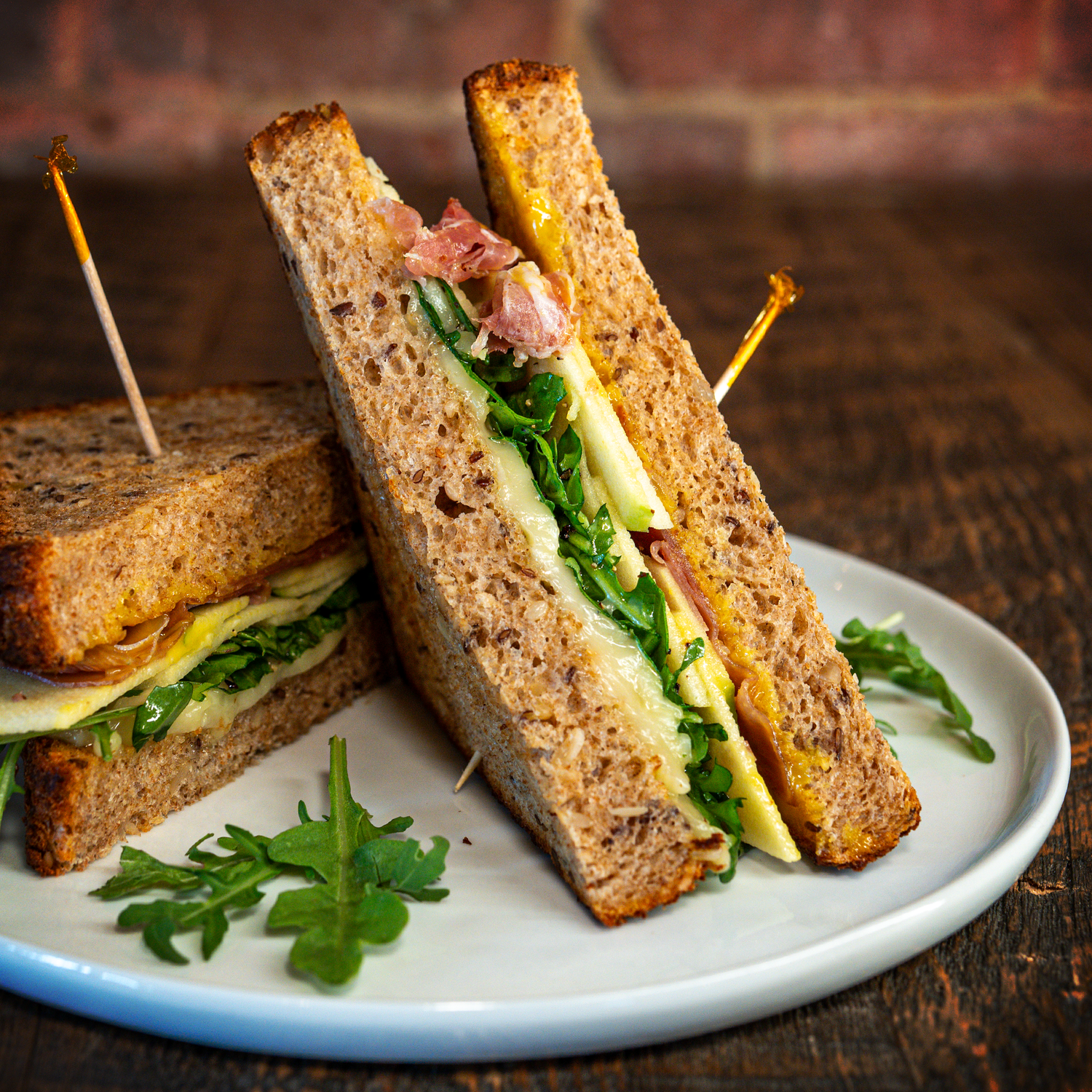 A delightful combination of creamy brie cheese, tart green smith apples, and savory prosciutto di parma, layered with fresh arugula and a touch of honey mustard, all served on hearty multigrain bread.