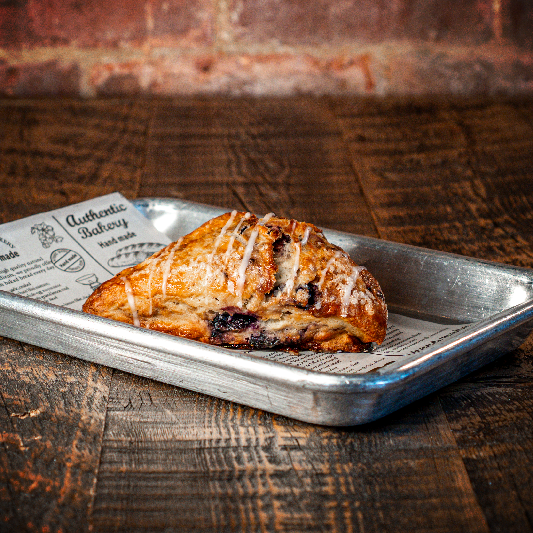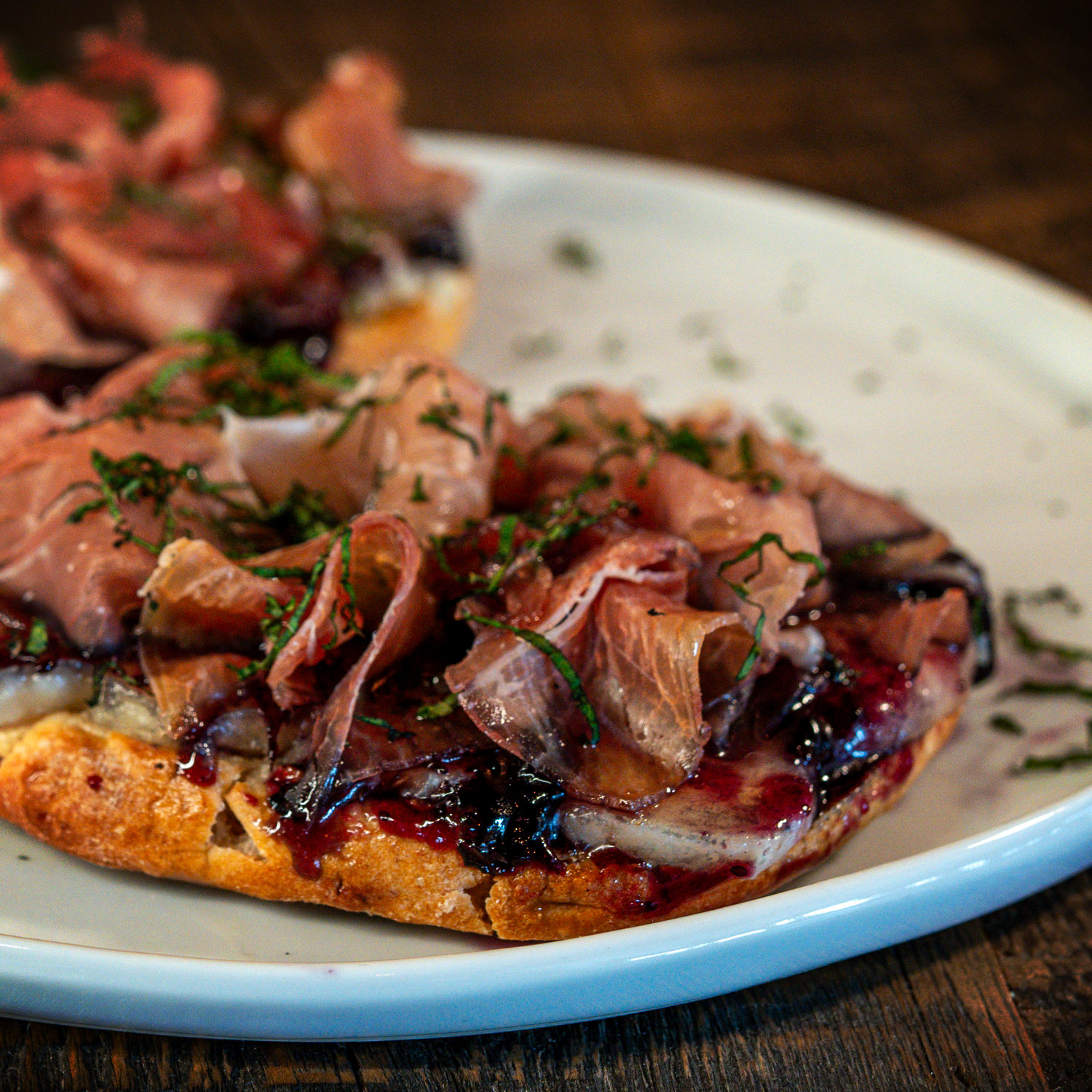 An open-faced English muffin topped with creamy melted brie cheese, savory jamon serrano, and a sweet wild blueberry preserve, finished with fresh mint and a drizzle of olive oil.