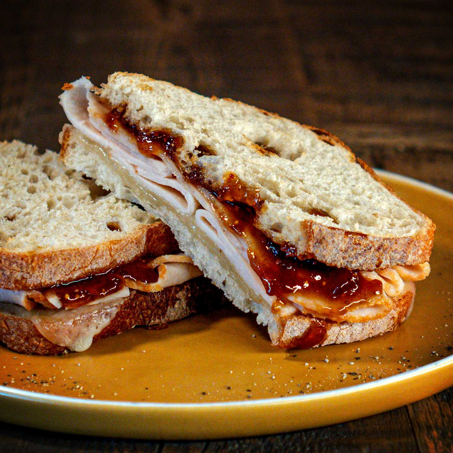 Sourdough bread layered with organic roasted turkey, manchego cheese, and a rich fig spread reduction.