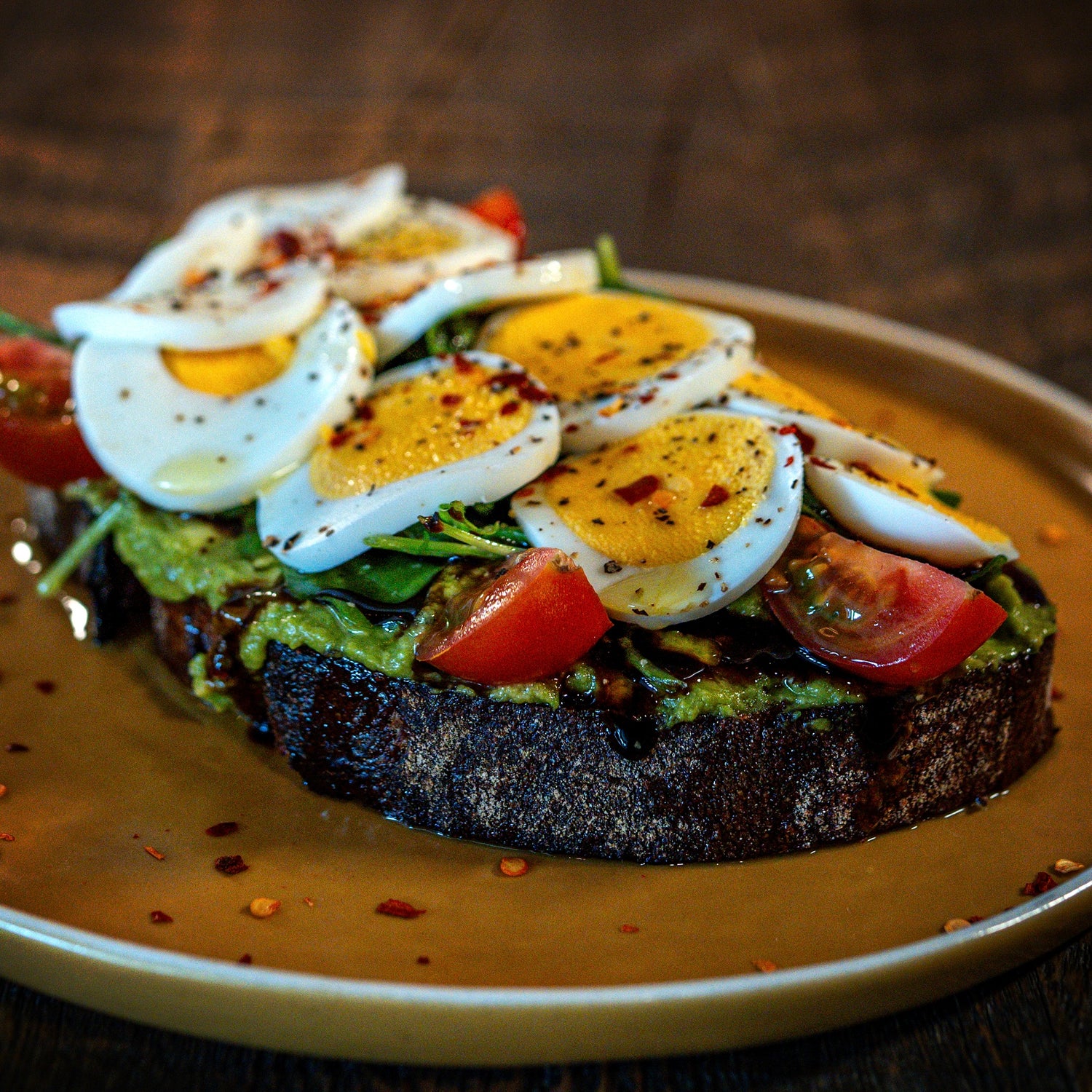 Toasted sourdough bread topped with creamy lime-infused avocado, fresh arugula, and juicy cherry tomatoes. Finished with slices of organic hardboiled eggs seasoned with salt, pepper, chili flakes, and a drizzle of olive oil.