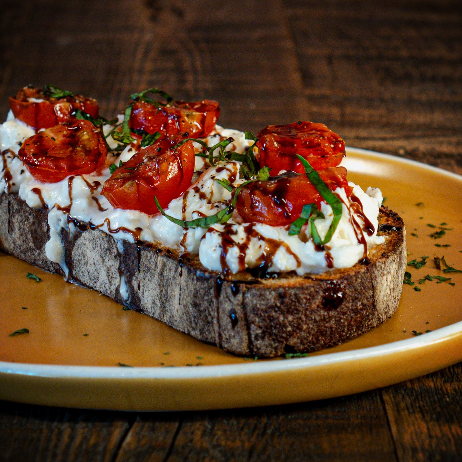 Creamy burrata served on toasted Pain de Campagne, topped with basil confit tomatoes, olive oil, and a balsamic glaze drizzle for a deliciously versatile dish.