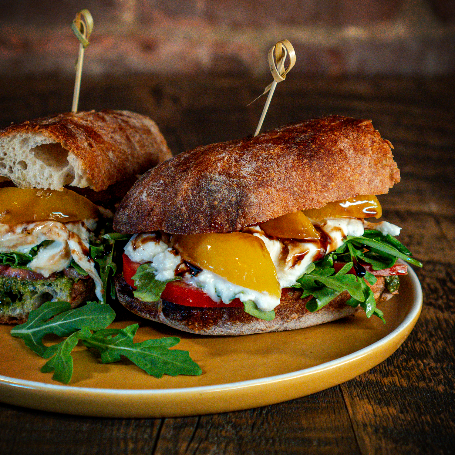 A rustic baguette topped with creamy nuts pesto, juicy heirloom tomatoes, fresh burrata, peppery arugula, sweet peaches, and finished with a balsamic glaze.