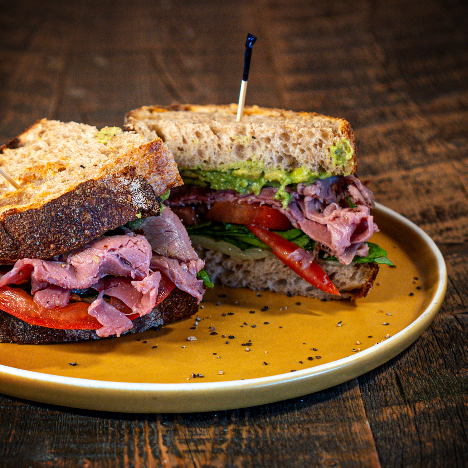Layers of savory roast beef, creamy mashed lime avocado, fresh spinach, and ripe heirloom tomatoes, topped with melted mozzarella cheese, served on whole wheat sourdough bread.